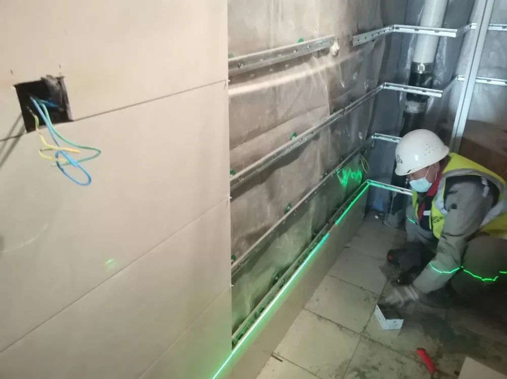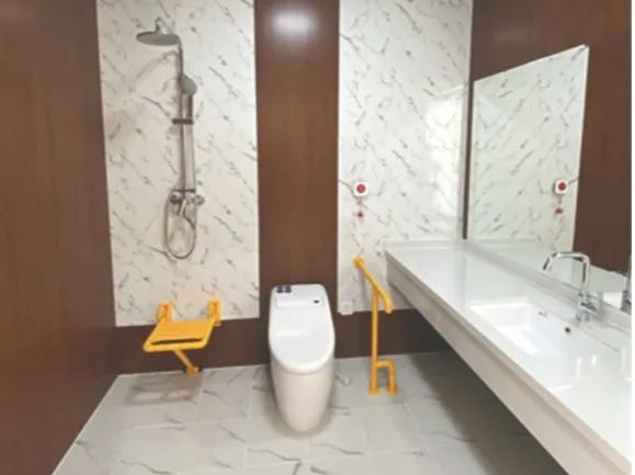 該項(xiàng)目衛(wèi)生間采用了300*600mm干法快裝鎖扣式瓷磚地面、墻面瓷磚�?倯�(yīng)用面積約800㎡。