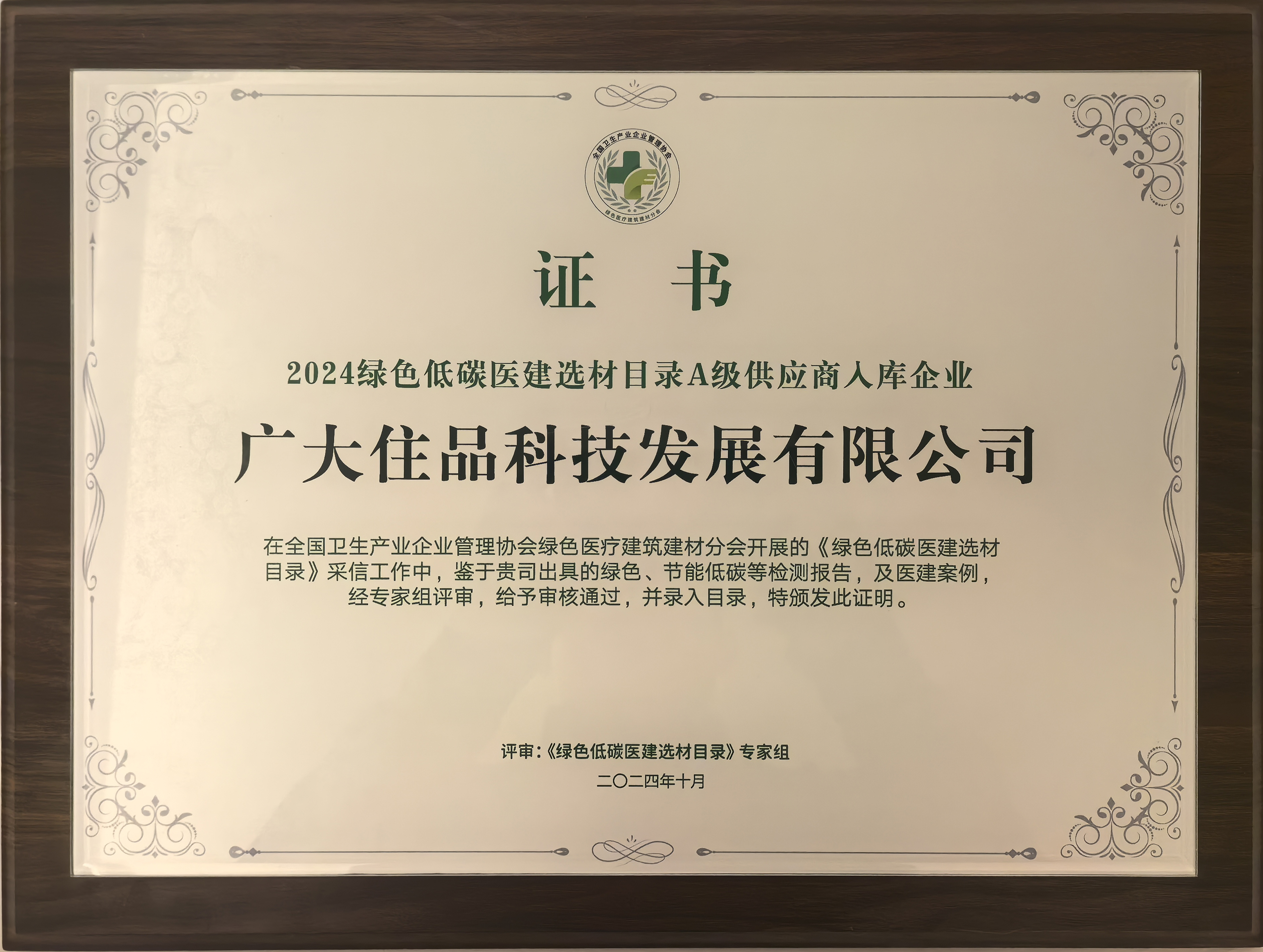 ▲廣大住品科技發(fā)展有限公司成功入選《2024綠色低碳醫(yī)建選材目錄》
